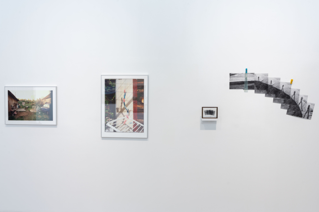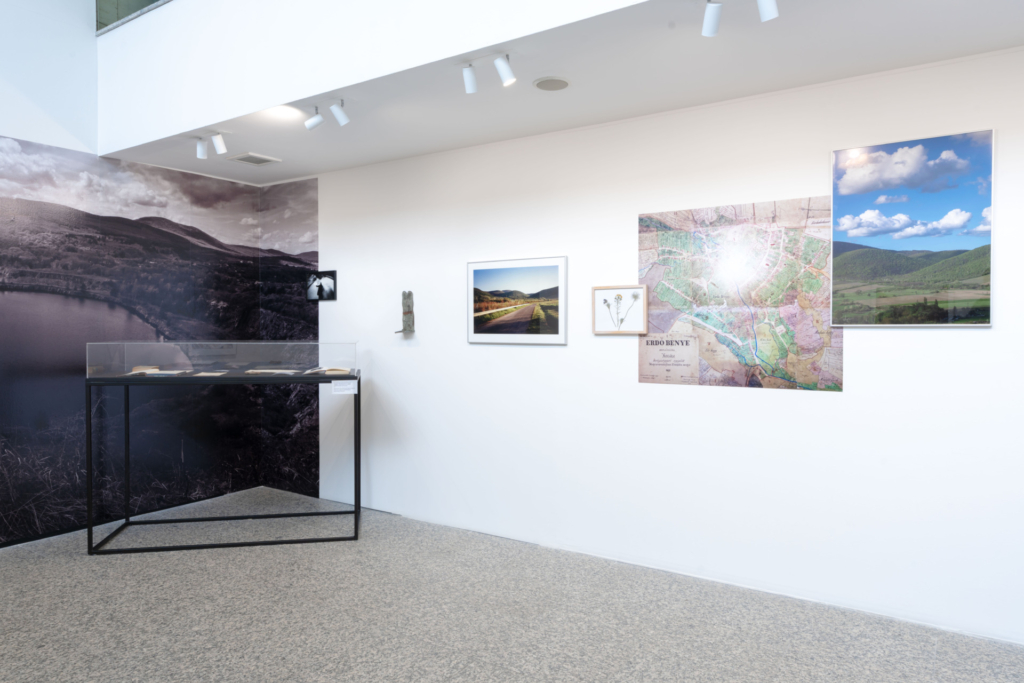 Ezután a jobb oldalon következik az üknagyapa, Ludwig Stein szülőhelyének, Erdőbényének mint az emlékezés forrásának vagy támpontjának a bemutatása. Az egyszerre természeti és történeti kivonatolás legkisebb szerveződési egysége a szárított és préselt virágok (mezei kökörcsin, farkas kutyatej), amelyek esszenciálisan őriznek valamit abból a vidékből. A virágok körüli képkeret széle egy régi – Ludwig Stein korából származó – térkép barna-zöld területére van elhelyezve. Izgalmas részlet, hogy a térkép felső harmadában jól látszik a fényképezés során használt vaku, ami az emlékezés esetlegességének és az emlékezés egészlegességét ellehetetlenítő vakfoltok metaforája. Apró, részletekig bontható figyelmesség még Rod térelrendező technikájában, hogy a kiállítás szinte minden elemét egymásba írja, áthidalhatóvá, átjárhatóvá teszi azokat, egyszerre referenciális és metaforikus szinteken tagolja, ezzel újabb zónákat nyitva a széleskörű befogadásnak. A térképen szereplő településhatár vonalát átvezeti saját tájképére, ezzel pedig vizuálisan összekapcsolja a képen látható hegyláncolat felső vonalát a földrajzi reprezentációval. Az oldalpár bal felén továbbra is Erdőbényéről készült fotók láthatók, ám ezúttal a korábbi panorámaszerű nézőpont helyett a részletek kerülnek előtérbe. Két felvétel a falu mindennapi életéből idéz meg pillanatokat: az egyik egy családi ház udvarát, a másik egy ruhaszárítót ábrázol, rajta a szárítócsipeszekkel. Az udvar felvétele az emlékezés helyszíneként, a mindennapi élet lenyomataként értelmezhető, míg a ruhaszárító gesztus szintjén kapcsolódik vissza a korábban megjelenített szárított virágokhoz. A csipeszek a rögzítés, a megőrzés és az időbeliség motívumait idézik: a kiszárítás mint cselekvés egyszerre jelöli az elmúlást és a konzerválás vágyát. Ezek a részletek finoman követnek egy vizuális logikát és az asszociatív emlékezés szerveződését.