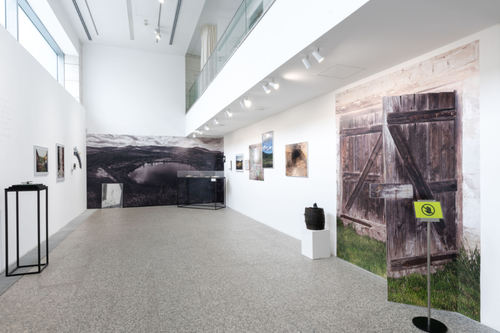 A jobb oldalon következő tárgyegyüttes egy régi boroshordó, tetején széttört borosüveg, parafadugó, földmaradványok. Ezt kiegészítve kicsit arrébb egy beomlott-elhagyatott borospince fényképe látható. Ezek nem a család személyes tulajdonába tartoztak, mindössze szimbolikusan utalnak a Stein család erdőbényei borászati tevékenységére. De itt nem pusztán egyszerű maradványokként állnak elénk, hanem az emlékezet anyagi archívumaiként közvetítő funkcióval is rendelkeznek. A pinceképpel szemben, a másik oldalon egy – valószínűleg a pince fölött elhelyezkedő – ház kicsinyített objektje látható, amit körülhatárol egy rozsdás vasspirál, az alapot pedig különböző fajtájú törött üvegdarabok mozaikozzák. A két oldalt elhelyezkedő, egymásra nyíló és egymást feltételező tárgyi emlékek ismételten a töredékességre helyezik a fókuszt. Ahogy a jobb oldalon a borosüvegmaradvány és a régi faanyag, a bal oldalt megjelenő rozsdás spirál és üvegdarabok is az idő anyagban maradt nyomait hordozzák. Az emlékezet működésének metaforáiként a lassan romló, oxidálódó fém és az üvegdarabok az átláthatóság és az áttetszőség mellett a részekből összeállított egész jelölői – vagy akár vonatkozhatnak az idő kettős természetére is.